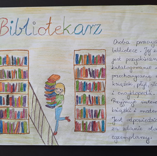Z okazji Dnia Bibliotekarza i Bibliotek w naszej szkole ogłoszono konkurs zawodoznawczy, którego celem było bliższe poznanie wybranego zawodu z branży książki: pisarz, bibliotekarz, księgarz, drukarz, ilustrator, tłumacz czy introligator.